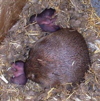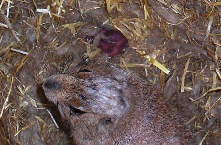 Am 29. September ließ Bonnie wieder seinen Paarungsruf verkünden. Wir konnten es kaum glauben, schließlich hatten Dawn und Bonnie doch erst im Januar 4 süße Babies zur Welt gebracht. Wie konnte es also sein, dass er sich gerade mal 8 Monate später wieder gepaart hat und mit wem? Bisher hieß es doch stets in allen Büchern, Präriehunde würden nur einmal im Jahr Junge bekommen und hinzu wäre es in der Heimtierhaltung extrem selten überhaupt Nachwuchs zu bekommen. Doch es war ja erstmal nur der Paarungsruf... Bloß weil er sich mit einem (oder gar beiden?) Weibchen gepaart hat, heißt das ja noch lange nicht das es auch wirklich wieder Junge gibt. In der ersten Woche war kaum etwas zu merken, aber zur Sicherheit haben wir den Tieren wieder eine große Auswahl an an Futter wie Obst, Gemüse, JR-Farm Powerfutter, Sonnenblumenkerne, Kokosflocken, Erbsenflocken und vielem mehr gegeben. In der darauf folgenden Woche wurden beide Damen sehr aktiv im Nestbau und bekamen kleine Bäuche. Daher nahmen wir uns vor die Tiere am Wochenende zu trennen, doch leider kam es bereits Freitags zu einem heftigen Streit zwischen den beiden Weibchen. Dawn hatte Maxi (die fast doppelt so groß ist) in eine Ecke gedrängt und mit Streu überhäuft. Sie ließ sich noch nicht einmal von mir ablenken, als ich dazwischen ging und Maxi ausgrub. Beide hatten am Ende einige Bissverletzungen. Dawn ließ ich bei Bonnie im Gehege und Maxi nahm ich wie schon im Januar raus. Maxi ist nicht ganz einfach, daher kann ich sie nicht zu den Nachzuchten setzen, die eh sehr Sanftmütig sind und nicht mit den rauen Sitten der Wildfänge klar kommen. In der dritten Woche zeigte sich, dass Maxi nicht trächtig ist, Dawn dagegen umso mehr... Dawns Zitzen wurden deutlich Sichtbar und der Appetit nahm auch stetig zu. Bei dem Bäuchlein, gingen wir schon von 6-10 Jungtieren aus. Am 03. November konnte man aus dem Tierzimmer wieder das Quietschen von PD-Babies hören. 3 gesunde Jungtiere kuschelten sich an den warmen Bauch von Dawn. Die 3 sind im Verhältnis zu dem Nachwuchs vom Januar ein ganzes Stück größer. Allerdings gebärte sie die Drei auch erst nach 35 Tagen. Der 1. Tag: Dieses Mal setzte schon am 1. Tag die Pigmentierung ein.