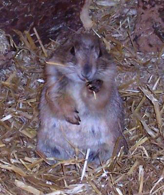 Interessant fand ich, dass Dawn schon vor der Paarung im Dezember 2004 keine anderen Weibchen mehr um sich herum duldete. Sie wurde Bonnie gegenüber extrem Besitz ergreifend, ganz anders wie dieses Mal. Beide Male verkündete Bonnie dann auch mit seinem durchdringenden Paarungsruf, dass die beiden zusammen kamen. Es waren mindestens 12 Stunden, in denen er fast pausenlos rief. Er ließ sich trotz seiner baldigen Heiserkeit dabei von nichts abbringen. Selbst Leckereien blieben liegen. Sie sehen, es ist kaum möglich die Paarung von zwei Präriehunden nicht mitzubekommen. Doch Paarung heißt nicht gleich Trächtigkeit... In einem solchen Fall ist es wichtig das evt. trächtige Tier getrennt oder nur mit dem Männchen zu halten. Andere Weibchen könnten eine große Gefahr darstellen (Infatizid). Bereits während der Schwangerschaft könnten sie das Muttertier psychisch negativ beeinflussen. Leider ist es auch alles andere als selten, dass die Jungtiere von anderen PD-Weibchen nach der Geburt gefressen werden. Aus diesem Grund sollte man wirklich vorsichtig sein und die Situation nicht unterschätzen. Viele dachten bereits ihre Tiere würden so etwas nicht machen... Sind ihre Weibchen doch immer so lieb zueinander, kuscheln und pflegen sich gegenseitig. Wenn die Tiere nicht gerade ein sehr großes Gehege zur Verfügung haben, wo sich die Weibchen problemlos aus dem Weg gehen können ist dies das generelle Todesurteil für die Babies. Auch die richtige Ernährung ist wichtig, damit das Tier alle benötigten Stoffe (verstärkt Eiweiß) hat und später auch genug Milch geben kann. Um sicher zu gehen, dass die evt. trächtigen Tiere im Falle einer Schwangerschaft das richtige Futter bekamen, haben wir ihr das JR-Farm Powerfutter und eine große Auswahl an Obst und Gemüse gegeben. Ich richtete täglich Teller mit Trauben, rote Paprika, Eisbergsalat, Gurke ect. für die Tiere her und dies nahmen sie meist auch gierig an. Übrigens kann man in der Zeit den Eiweißbedarf auch mit ein wenig Natur-Joghurt oder auf natürliche Weise mit Heuschrecken oder Mehlwürmern zusätzlich decken. Auch wenn sie wissen, dass die ihre Tiere solche Dinge eigentlich nicht mögen, sollten sie es probieren. Denn die Tiere haben während der Trächtigkeit andere Leidenschaften bezüglich der Ernährung wie sonst. Ist bei uns Menschen ja auch nicht anders... Mehr darüber, wie es bei uns verlief können sie in unsren "Nachwuchs-Tagebüchern" unter Nachwuchs Januar 2005 und Nachwuchs November 2005 nachlesen.